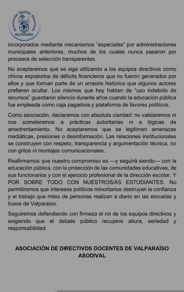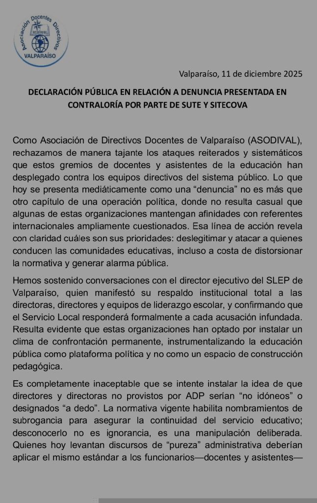 ASODIVAL desmontó la denuncia como «ataques reiterados y sistemáticos» de gremios docentes y asistentes, motivados por afinidades políticas cuestionadas y no por defensa educativa. «Lo que hoy se presenta mediáticamente como una denuncia no es más que otro capítulo de una operación política», afirma el texto, respaldado por el director ejecutivo del SLEP Valparaíso, quien prometió respuestas formales a cada punto infundado.